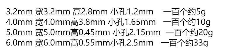 3.2mm about 5000 PCS/bag | 6.0mm about 5000 pieces/bag | 5.0mm about 5000 pieces/bag | 4.0mm about 5000 pieces/bag